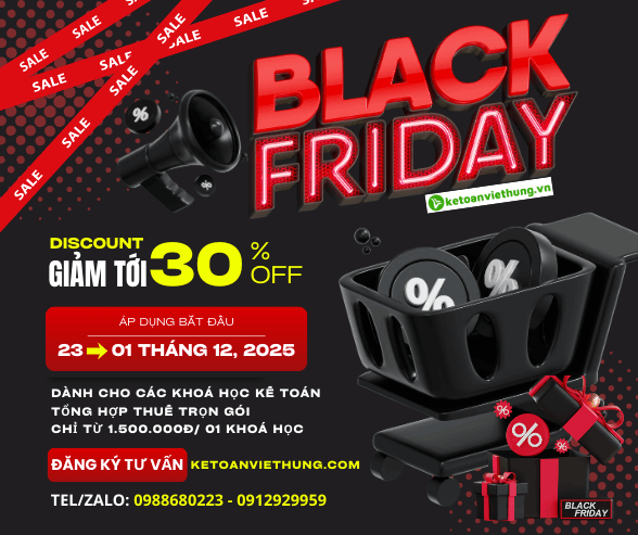 BLACK FRIDAY LỚN NHẤT NĂM 2025 – THỜI GIAN CÓ HẠN. Các bạn hãy NHANH TAY ĐĂNG KÝ NHẬN NGAY ƯU ĐÃI trong thời gian giảm giá học phí tất cả khóa học tế toán để nhận được ưu đãi hấp dẫn và những món quà vô cùng bất ngờ với kế toán VIỆT HƯNG.